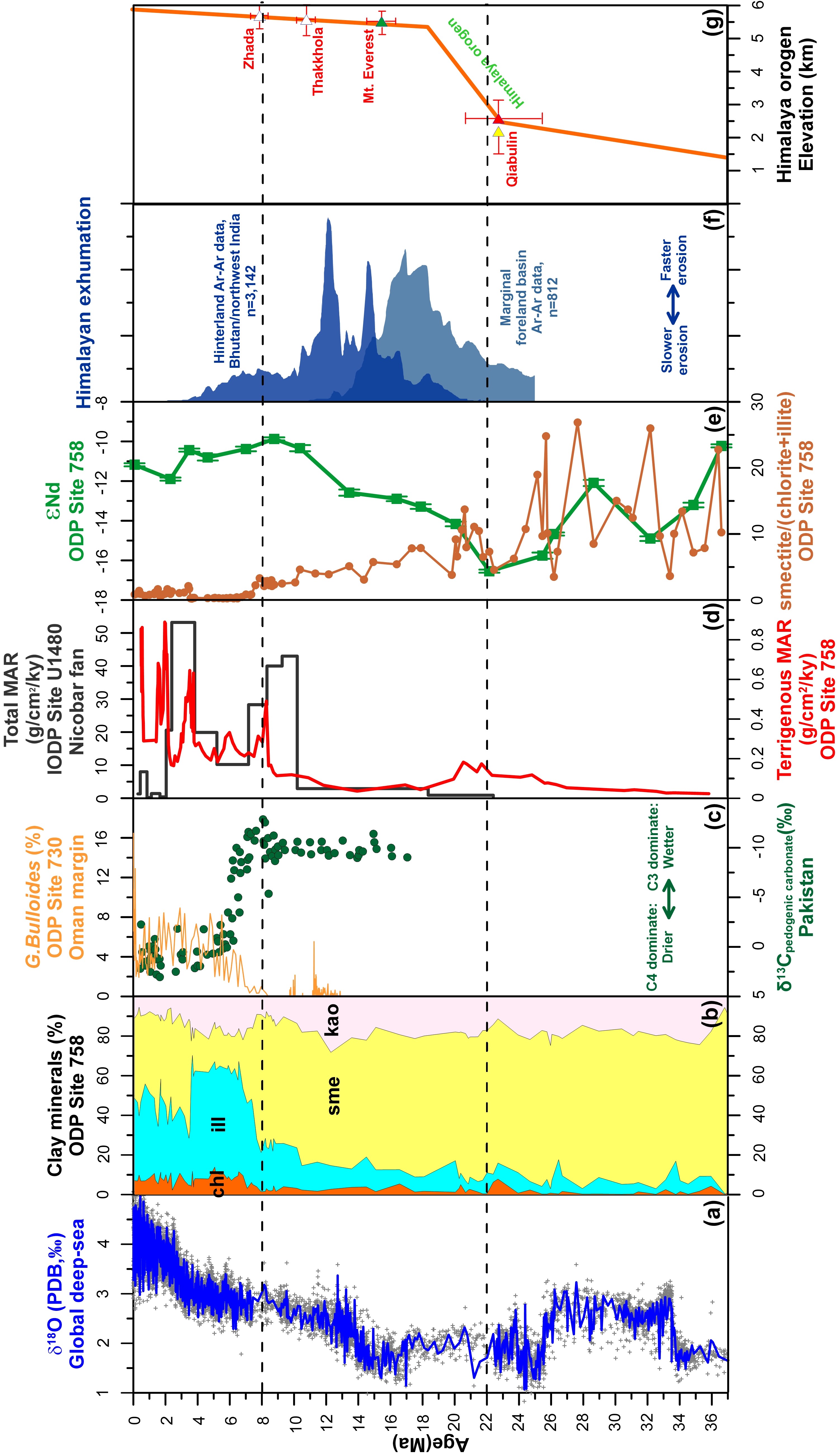 綜合對比研究南亞區域的構造和氣候演化(圖3),研究人員認為發生于中新世早期(約2200萬年前)和中新世晚期(約800萬年前)的喜馬拉雅造山帶的兩期隆升是南亞河流發育和孟加拉灣南部沉積物物源變化的主要控制因素。晚中新世以后的全球變冷和南亞的氣候變干可能加劇了喜馬拉雅地區硅酸鹽礦物的物理侵蝕作用,在此期間向孟加拉灣貢獻了相對更多的伊利石和綠泥石。結合沉積物源轉換、板塊構造演化歷史以及喜馬拉雅-青藏高原隆升運動等事件表明,伊洛瓦底江和雅魯藏布江-布拉馬普特拉河可能起源于早中新世(約2200萬年前),并在晚中新世(約800萬年前)最終形成,自此成為類似現代流域規模的南亞河流系統(圖4)。