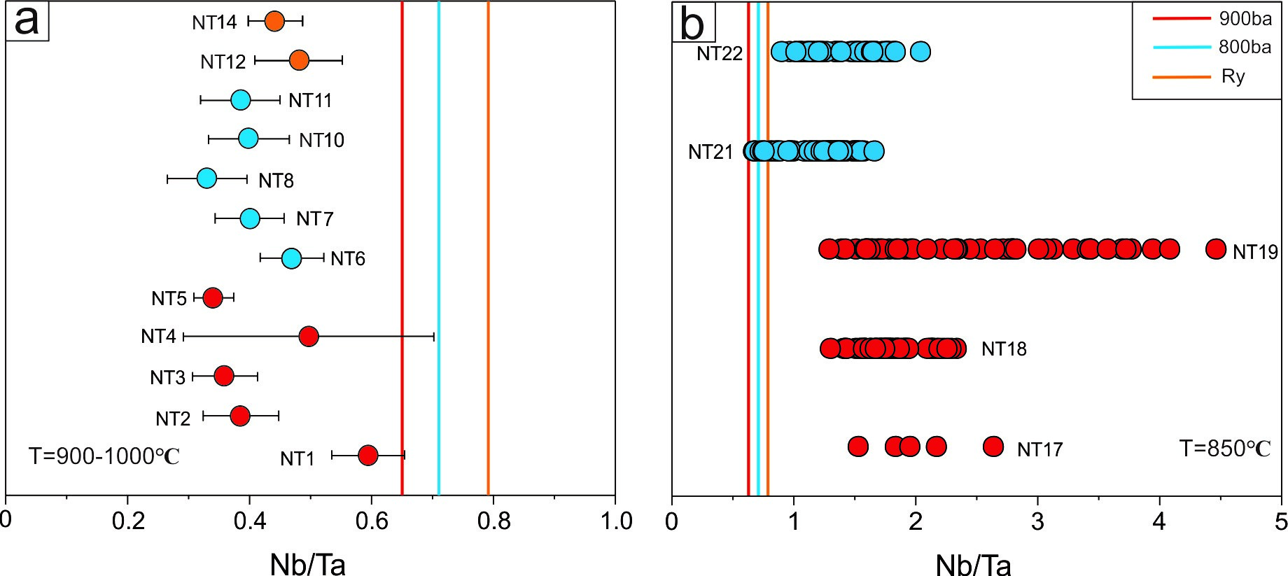 圖1. 金紅石平衡條件(a)與非平衡條件下Nb/Ta值與初始物對比(注:非平衡結(jié)晶可以形成金紅石中高Nb/Ta特征)