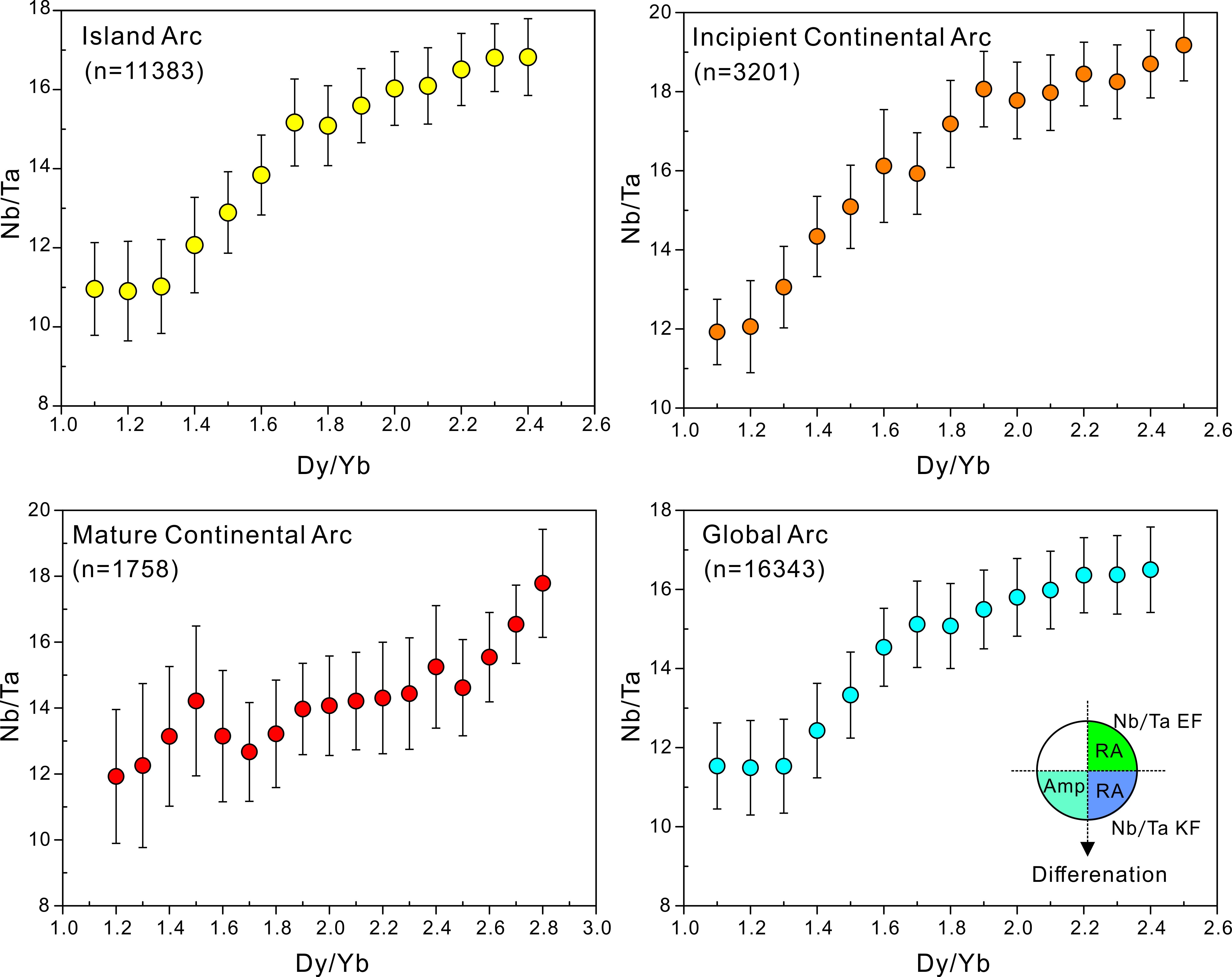 圖3. 全球弧巖漿Nb/Ta與Dy/Yb相關(guān)圖解(Nb/Ta比值變化與Dy/Yb相關(guān)度較高,顯示角閃石分離結(jié)晶的影響)