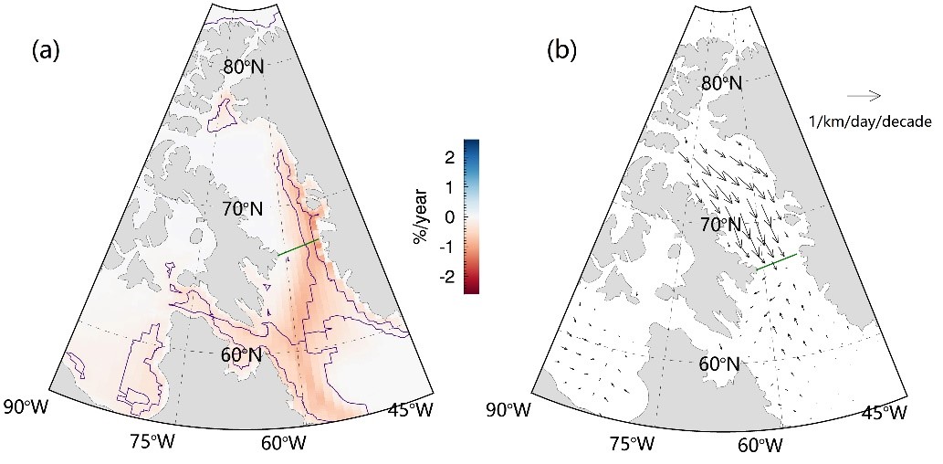 海冰輸出是維持北極海冰物質平衡的重要動力機制。位于格陵蘭島與巴芬島之間的巴芬灣地區向南的海冰輸出是北大西洋的重要淡水輸入來源。輸出的海冰融化后可降低拉布拉多海等南部海域的表層鹽度,減弱海洋垂直交換作用,甚至可影響北大西洋經向翻轉流的強度,對局部乃至全球氣候產生影響。
