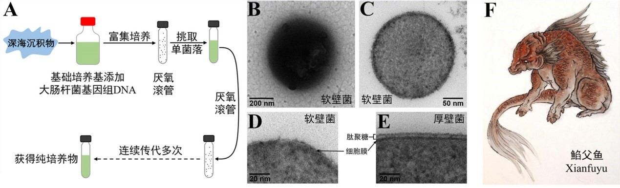 深海蘊含著海量的微生物資源,卻是地球上人們了解最少的生境之一。迄今為止,99.9%以上的深海微生物無法獲得純培養(yǎng),稱之為難培養(yǎng)微生物,是地球上尚未實現(xiàn)有效開發(fā)的巨大生物資源庫。軟壁菌門是一類獨特的難培養(yǎng)微生物類群,此類菌無細胞壁卻由厚壁菌門進化而來。根據(jù)宏基因組預(yù)測結(jié)果可知它們具有突出的核酸降解能力,對磷、氮等元素的循環(huán)有重要驅(qū)動作用,而且還能自如應(yīng)對深海高壓和陸地常壓環(huán)境,在進化、耐壓和元素循環(huán)等方面有獨特的研究價值。但是由于軟壁菌生長慢、豐度低,迄今國際上還沒有獲得任何深海生境的純培養(yǎng)菌株,阻礙了對其進一步深入研究。