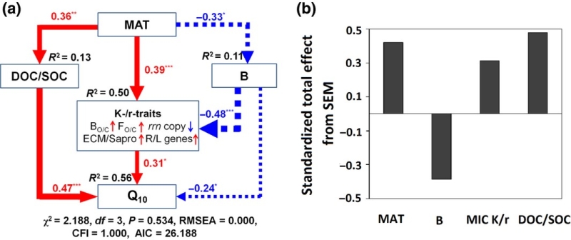 圖1 基于結構方程模型(SEM)分析年均溫(MAT)、有機質質量和有效性、微生物生態策略對有機質礦化溫度敏感性(Q10)的直接效應和間接效應