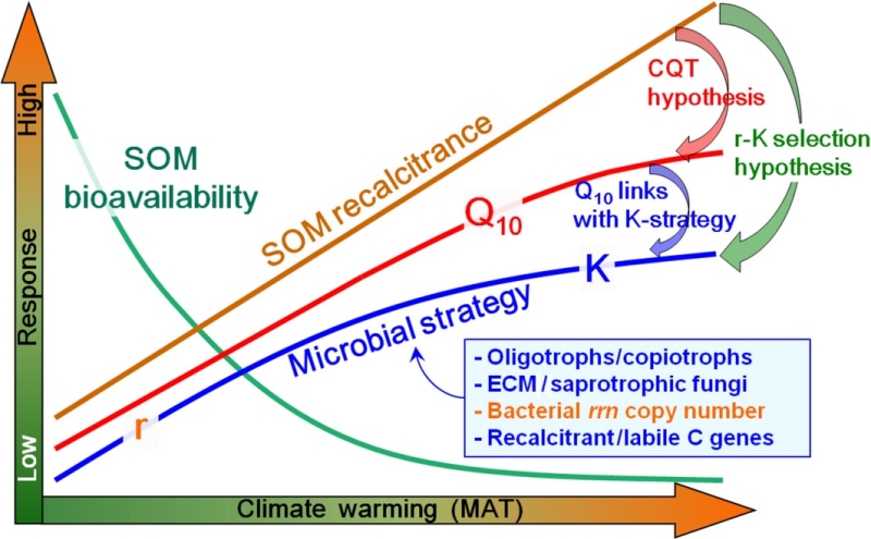 全球變暖加速土壤有機質(SOM)分解和CO2釋放,研究SOM分解的溫度敏感性(Q10)對全球變暖的響應,對于未來氣候變化下的全球碳收支預測至關重要。然而,由于Q10、SOM質量和微生物生態功能之間的復雜關系,Q10對持續增溫的響應趨勢及其驅動機制尚存在較大爭議,特別是缺乏微生物基因組學相關證據支持。