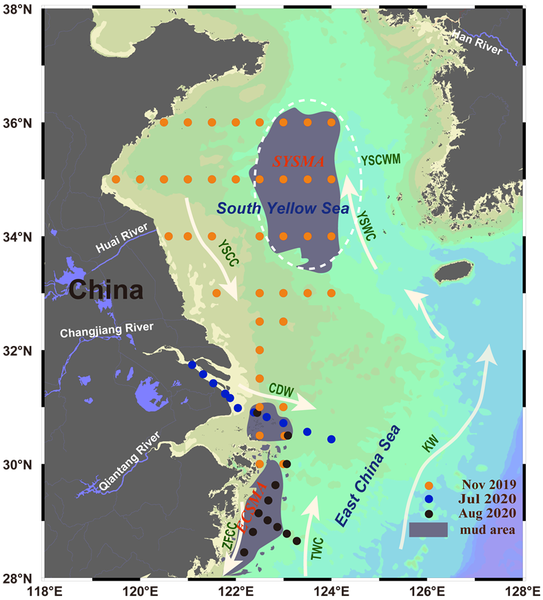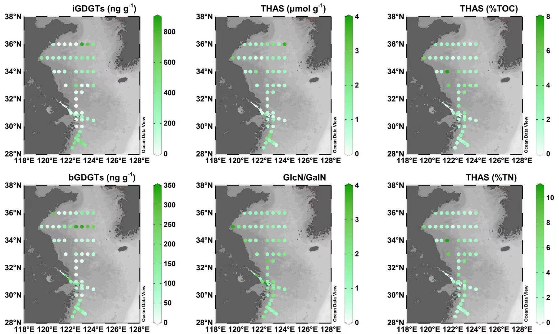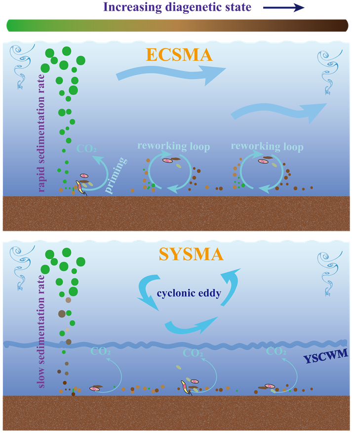 研究人員通過對三個航次黃東海表層沉積物中總有機碳及其穩定同位素以及多重生物標志物(氨基糖AS,甘油二烷基甘油四醚GDGTs)的研究,對比分析黃海和東海泥質區有機碳濃度、沉降速率和有機碳活性,發現黃、東海泥質區具有截然不同的有機碳活性與埋藏模式。黃海泥質區由于受到黃海冷水團(低溫、低氧特征)和氣旋型渦流的影響,導致這一區域有機碳沉積速率較慢,且有機碳在水柱中經歷了較高程度的降解,其所埋藏的有機碳活性較低,傾向于長久保存。而東海泥質區沉積速率較快,埋藏的有機碳活性較高,但復雜的水動力過程促使物理再造過程和活性有機質對惰性有機質的激發效應使得有機碳的再礦化速率較高。以上因素解釋了盡管東海泥質區有機碳的沉降通量是黃海泥質區的5倍,但兩個區域有機碳埋藏效率卻相差不大(~35%)的原因。盡管目前黃海泥質區有機碳的絕對埋藏通量遠小于東海泥質區,但隨著人類擾動和全球氣候變化的加劇,以黃海泥質區為代表的遠端泥質區在有機碳埋藏中扮演的角色可能會越來越突出,而大河影響下的內陸架泥質區(如東海泥質區),其有機碳埋藏量可能會大量減少。