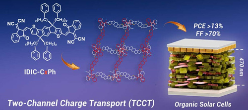 最近,青島能源所先進(jìn)有機(jī)功能材料與器件研究組在前期非富勒烯受體的新型側(cè)鏈工程研究基礎(chǔ)上(Adv. Mater., 2019, 31, 1807832; Adv. Funct. Mater., 2020,30, 2007088等),進(jìn)一步系統(tǒng)研究并深入揭示了烷基側(cè)鏈的影響,實(shí)現(xiàn)了對(duì)分子堆積、捕光層形貌及電荷傳輸更為精細(xì)的調(diào)控。研究發(fā)現(xiàn)側(cè)鏈烷基碳數(shù)細(xì)微調(diào)控對(duì)共軛材料分子堆積方式展現(xiàn)出截然不同的影響,在側(cè)鏈碳數(shù)為5時(shí)的IDIC-C5Ph受體中存在奇特的分子堆積,我們首次提出了雙通道電荷傳輸(TCCT)概念,可實(shí)現(xiàn)了電荷更為高效的傳輸與提取。光伏性能結(jié)果表明,IDIC-C5Ph基器件最優(yōu)條件下的填充因子(FF)可高達(dá)80.02%,是常規(guī)有機(jī)光伏器件中的最高值之一??紤]到TCCT特性在電荷傳輸及抑制復(fù)合方面的優(yōu)勢(shì),IDIC-C5Ph基器件隨著膜厚增加到307 nm時(shí)FF仍然高達(dá)75%,媲美大多數(shù)報(bào)道的低膜厚器件數(shù)據(jù);進(jìn)一步增加到470 nm時(shí),F(xiàn)F依然大于70%,PCE達(dá)到13%。與之對(duì)比,常規(guī)單通道電荷傳輸?shù)腎DIC-C4Ph器件,最優(yōu)膜厚105 nm時(shí)具有較高的FF(78.05%)和轉(zhuǎn)換效率,但隨著厚度增加FF明顯降低(300 nm, FF=70.12%; 485 nm, FF=65%)。這些結(jié)果表明側(cè)鏈誘導(dǎo)的TCCT特性賦予電池低的膜厚敏感性,對(duì)大面積電池印刷制備具有重要推動(dòng)意義。