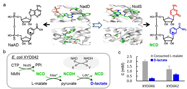 本研究以煙酸單核苷酸(NaMN)腺苷酰轉移酶(NadD)為模板,半理性設計并改造其底物NaMN和腺苷三磷酸(ATP)的結合口袋,獲得偏好煙酰胺單核苷酸(NMN)和胞苷三磷酸(CTP)的突變體,即NCD合成酶(NcdS)。該團隊在大腸桿菌中表達NcdS,實現利用內源的CTP和NMN合成NCD;通過強化前體合成步驟,胞內NCD含量可超過天然輔酶,達到5.0mM,獲得NCD自給型平臺菌株。此外,該團隊還通過表達NCD偏好型蘋果酸酶和D-乳酸脫氫酶,實現NCD介導的L-蘋果酸高選擇性轉化為D-乳酸。該工作為細胞內合成非天然輔酶奠定了基礎,為后續合成生物學和化學生物學研究提供了參考。
