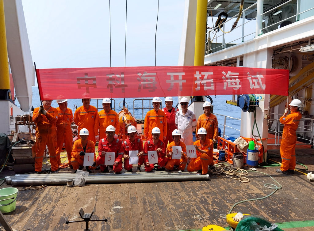 “中科海開拓”系列3500米級深水可視化可控沉積物柱狀取樣系統(tǒng)搭載“海洋地質(zhì)九號”地球物理勘探船,在我國南海神狐海域1778m水深成功完成海試驗收,獲取單柱、連續(xù)、低擾動沉積物柱狀樣品15.83米,取樣率88%,超過該取樣系統(tǒng)15米的設計最大取樣長度,創(chuàng)造了該海域具有姿態(tài)和方位信息樣品的最長記錄,大幅刷新了青島海洋地質(zhì)研究所地質(zhì)取樣長度記錄(9.5米)。