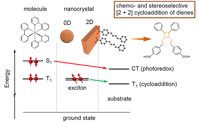 納米晶的獨特性質使其成為一類理想的光敏劑材料。通過調節尺寸即可對納米晶的光響應范圍實現寬譜調諧,且導帶和價帶能級(分別對應于化學中的還原和氧化電位)也隨之變化,適用于各類光氧化還原反應。吳驪珠團隊和美國西北大學Weiss教授團隊等都在該領域作出了重要貢獻。除了光氧化還原以外,基于納米晶敏化分子三線態的[2+2]環加成反應是納米晶在有機合成中的又一類重要應用。由于半導體納米晶的電子交換作用弱,其明暗態劈裂(類似于有機分子的單-三線態劈裂)僅為meV量級,在室溫下可忽略不計。該特性保證了納米晶光催化芳基共軛雙烯[2+2]環加成的高度化學選擇性,避免了氧化還原導致的[2+4]加成等競爭路徑,這是傳統分子光敏劑無法做到的。此外,由于底物和產物分子在納米晶表面的吸附,納米晶光敏劑還具有一定的模板效應,有助于實現區域和立體選擇性的[2+2]環加成。因此,納米晶敏化劑兼具均相和異相催化的特性。