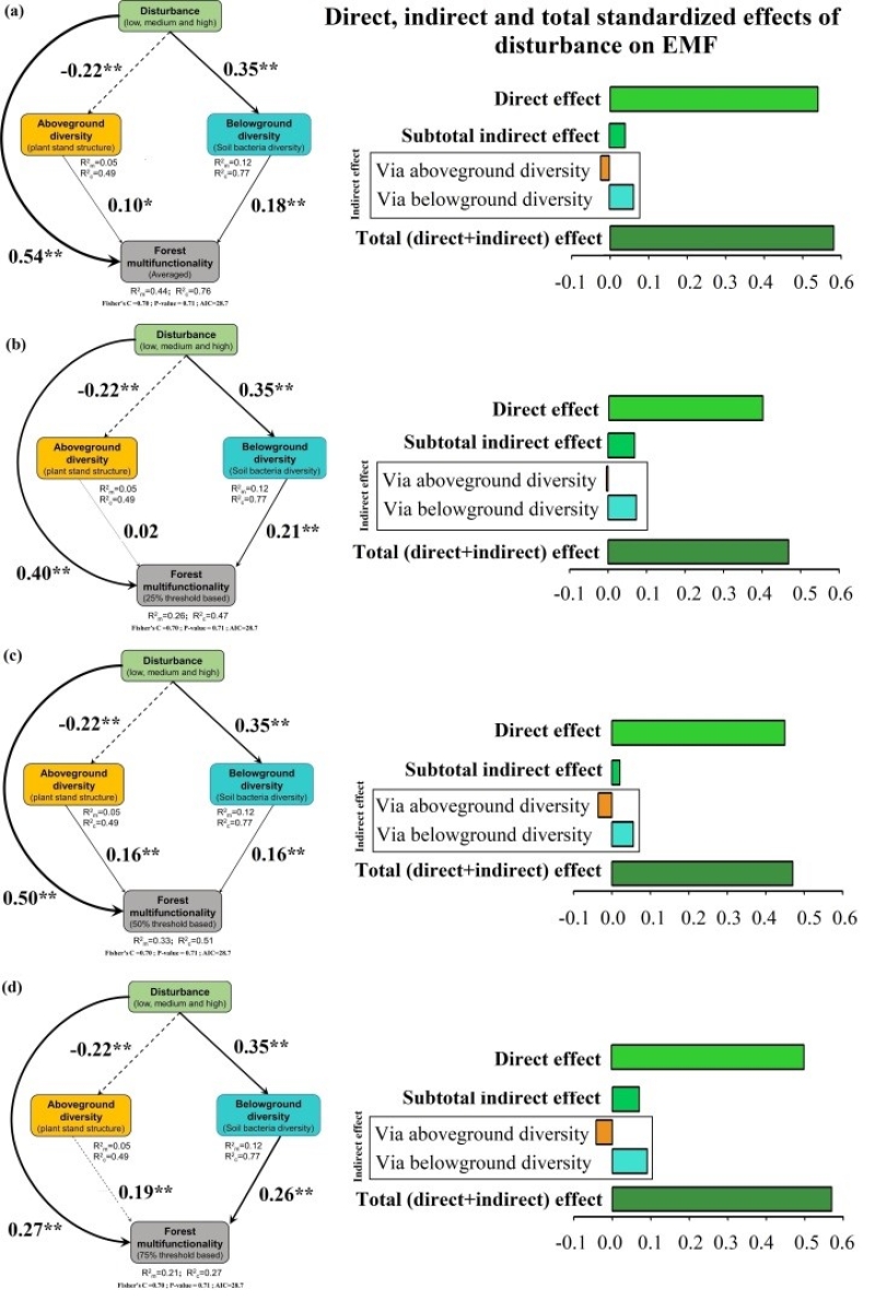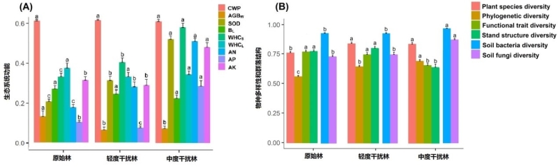 鑒于此,中國科學院沈陽應用生態研究所天然林生態課題組成員在長白山區分別選取未經過擇伐干擾(原始林)、輕度擇伐(10~20%強度)和中度擇伐(20~30%強度)干擾的3種林型共11塊樣地為研究對象,測定了群落生產力、土壤碳儲量和土壤/凋落物持水能力等9種生態系統功能,綜合運用均值法、多閾值法和單功能法度量了生態系統的多重功能,對比分析了氣候因子、干擾強度、植物屬性和土壤微生物對生態系統多重功能的相對貢獻。結果發現:1)群落生產力、地被物生物量和持水力在三個林型中沒有顯著差異(圖1A),經過擇伐森林中土壤有機碳密度、土壤持水力、土壤有效氮、有效磷和有效鉀等功能指標甚至已超其初始狀態(原始林),表明該區域曾受擇伐干擾的次生林具有較強的自我恢復力。2)擇伐后次生林在恢復過程中,物種多樣性和林分結構表現出不同的變化趨勢。例如,盡管受中度干擾森林具有較低的功能性狀多樣性和林分結構多樣性(圖1B),但其比原始林擁有更高的物種、譜系和土壤微生物多樣性。3)植物屬性(如分類、譜系、功能性狀和林分結構多樣性)對不同多重功能指數同時具有或正或負的影響,土壤細菌多樣性和林分結構多樣性對多重功能具有較強的預測力,而氣候因子的影響相對較?。▓D2);4)地上和地下生物多樣性在干擾對多重功能的調節作用中存在相反路徑(圖3)。該研究表明合理擇伐可能使林地資源得到充分利用,促進保留木生長和提升生態系統整體功能,并且能提高樹種和土壤微生物多樣性,是調控森林生物多樣性和生態系統功能的有效手段。