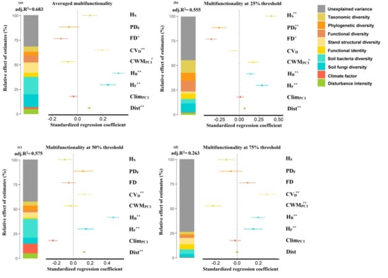 圖2 氣候因子、干擾強度、植物屬性和土壤微生物對生態系統多重功能的相對貢獻