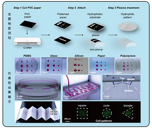 針對上述問題,該合作團隊提出利用切割機制造柔性聚氯乙烯(polyvinyl chloride,PVC)鏤空掩膜并結合等離子體處理方式實現了在不同材質、不同基底形貌(平面與非平面)形成微米尺度的親疏水界面。合作團隊將上述工藝與液體模具工藝技術相結合,成功實現了不同形貌基底(平面、曲面、不規則)基底的聚二甲基硅氧烷(PDMS)微流控芯片制造、細胞圖案化等應用。該過程時間短、操作簡單且環境友好,為在不同形貌基底上進行微流控芯片制造、細胞圖案化以及材料表面改性等提供了一種操作簡單、便捷及低成本的技術路線。