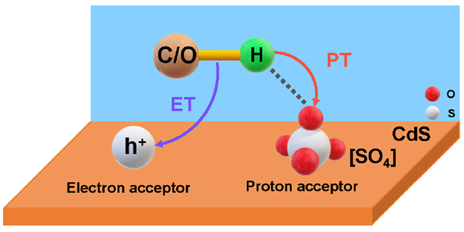 本工作中,合作團(tuán)隊(duì)利用等離子體氧化法制備了表面具有硫酸根的[SO4]/CdS催化劑,[SO4]可以作為質(zhì)子受體,有效縮短質(zhì)子傳輸?shù)木嚯x,促進(jìn)質(zhì)子耦合電子轉(zhuǎn)移過程(PCET)。該催化劑在光催化生物質(zhì)多元醇制合成氣反應(yīng)中,一氧化碳和氫氣的產(chǎn)生速率分別是CdS的9倍和3倍。本研究為光催化劑活性調(diào)控提供了新思路。