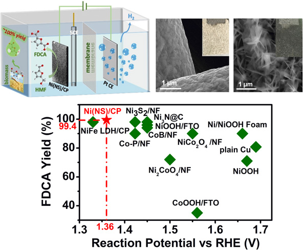 生物質作為一種新型的可再生非化石資源,被認為是潛在化石資源替代品。5-羥甲基糠醛(HMF)作為生物質資源的重要代表性平臺產品之一,可以作為原料生產多種高附加值化合物。將電氧化HMF與在新能源領域中具有重要研究意義的析氫反應耦聯是一種極具應用前景的綠色策略,不僅能夠突破電催化水裂解體系的動力學瓶頸,而且能夠有效降低體系電能消耗。然而,目前該研究方向仍處于概念驗證的初始階段,并面臨許多挑戰。
