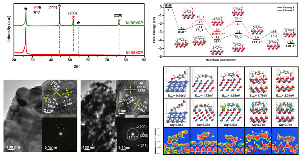 制備獲得的鎳納米片/碳紙復合電極能夠在較低的反應電位(1.36VRHE)下高選擇性電催化HMF氧化生成2,5-呋喃二甲酸(FDCA)并耦合高效析氫反應,反應體系對目標產物FDCA的選擇性和產率均接近100%,生成H2的法拉第效率為95.3%,且該催化劑展示出較高的穩定性,經多次重復利用后仍無活性衰減現象。關聯鎳納米片/碳紙復合電極材料的活性與結構可以發現這種優異的催化性能主要來源于碳紙上負載的鎳納米片較低的結晶度、更多的邊緣位點以及獨特的電子結構。處于邊緣位缺電子狀態的鎳單質容易在反應過程中被原位氧化為具有更高價態的Ni +物種(NiO 或 NiOOH細小晶粒),從而顯著提高了鎳納米片/碳復合電極的催化活性。第一性原理計算明確了催化反應路徑并揭示了催化活性的提高主要來源于Ni +物種對HMF更有利的吸附構型、較強的吸附能和較低的基元反應步驟能壘。