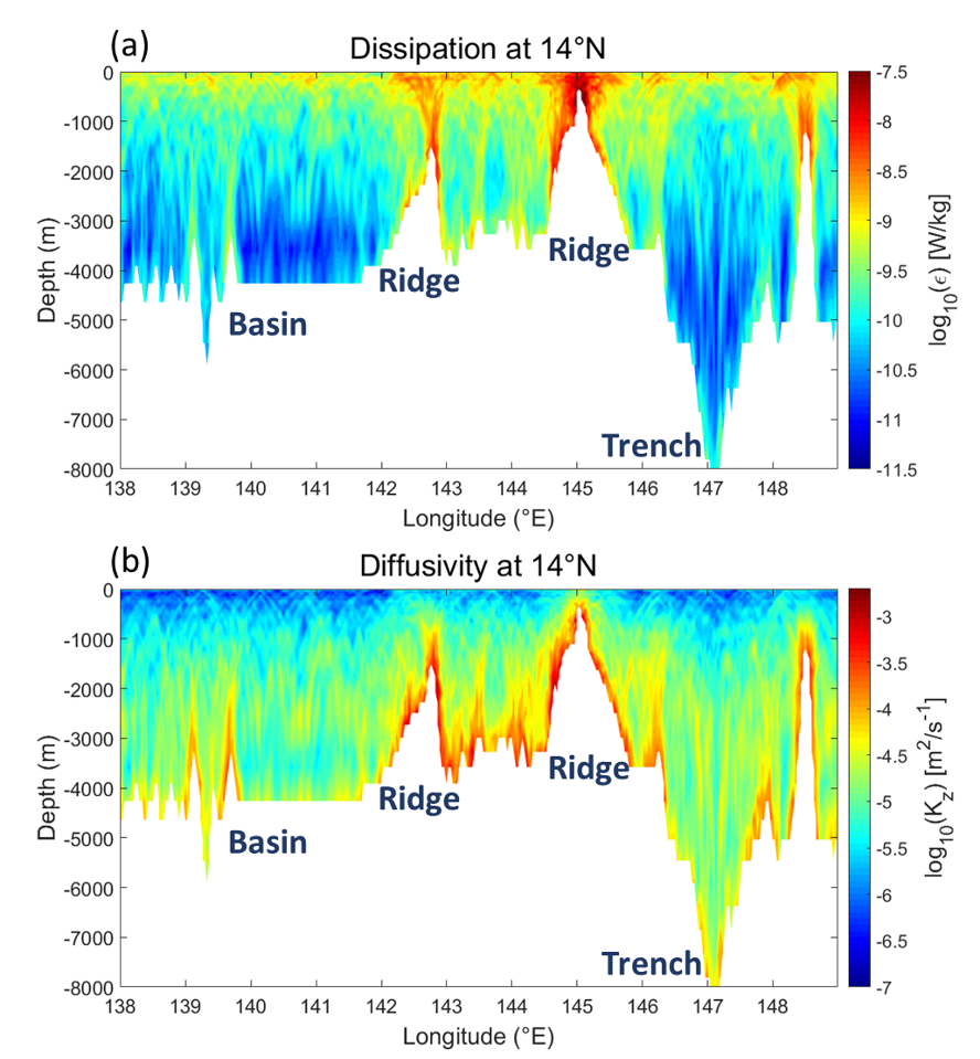 馬里亞納溝弧盆斷面內潮耗散率和混合率分布