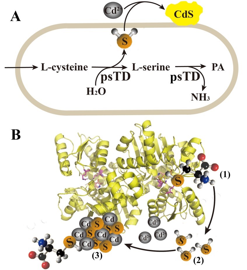 重金屬鎘在深海環境中廣泛存在,深海微生物進化出了成熟且多樣的鎘耐受機制以維持在鎘環境中的生長和繁殖。與此同時,環境中與鎘共存的化合物如半胱氨酸可顯著影響深海微生物的鎘抗性。在研究一株深海假單胞菌鎘耐受機制的過程中,發現半胱氨酸的存在可以有效促進細菌形成硫化鎘納米顆粒,進而顯著提高細菌的鎘抗性和脫除率(圖1)。通過蛋白質組學和基因敲除等方法發現該菌產生的蘇氨酸脫水酶(threonine dehydrase, TD)具有半胱氨酸脫硫酶活性,該酶通過催化半胱氨酸脫硫生成硫化氫來參與細菌的鎘耐受過程。通過TD的異源表達和分離純化進一步確定了重組蘇氨酸脫水酶(rTD)在胞外仍具有半胱氨酸脫硫酶活性,并分析了其催化反應的過程。