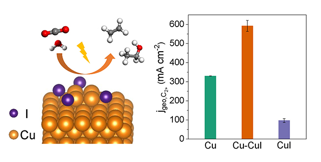 Cu0/Cu+界面CO2電催化還原示意圖和Cu、CuI及Cu-CuI復合催化劑在-1.0 V vs. RHE時生成C2+產物的幾何分電流密度圖