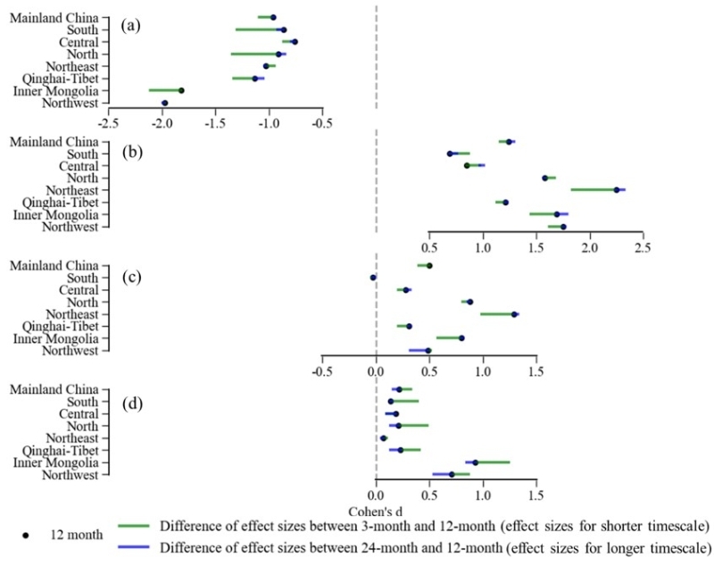 沈陽生態所景觀過程組研究團隊基于1970-2010年中國區域695個氣象站的氣象數據,通過計算6種不同的干旱指數評估中國不同區域的干旱頻率變化趨勢,分析干旱評估結果的不確定性,從而量化了氣候因素(日降水量、地表最高氣溫、地表最低氣溫、地表平均氣溫、風速、日照時數、相對濕度、大氣壓和海拔高度)和時間尺度(3、12和24個月)及其交互作用對干旱評估結果的影響和相對貢獻。結果表明:1)時間尺度對于干旱評估結果的影響小于氣候因素,兩者的交互作用不可忽視;2)在更加干旱或濕潤的區域,氣候因素和時間尺度對干旱評估結果的影響更明顯;3)在內蒙古草原區和東北區域,干旱評估結果受到時間尺度的影響更大,這兩個區域在使用干旱指數時需要更注重時間尺度的選擇。本研究的結果能夠為挑選合適的干旱指數進行干旱評估提供參考,同時為干旱預警預防和防災減災提供科學依據。