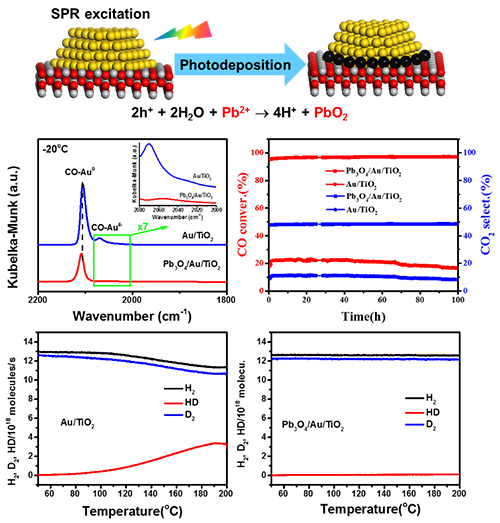 近日,中國科學院大連化學物理研究所院士李燦團隊與研究員黃家輝團隊合作,采用自主發展的等離激元輔助光沉積策略(J. Am. Chem. Soc.,2017),在Au-TiO2界面處選擇性沉積惰性的鉛氧化物,從而封堵高活性的Au-TiO2界面位點,將反應活性中心從非選擇性的界面區域轉移到高CO選擇性氧化的金屬表面區域,最終實現優異的CO-PROX催化反應性能。