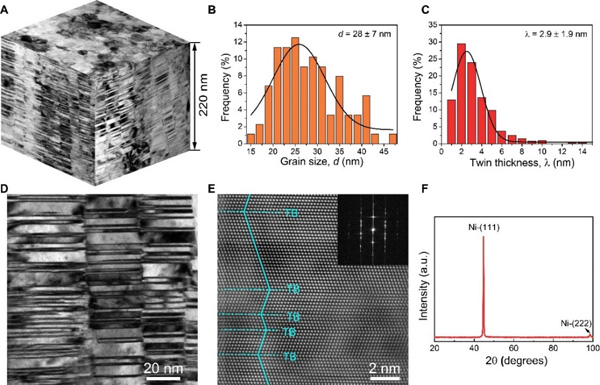 圖1 =2.9nm的納米孿晶Ni的微觀結構。(A)典型的三維結構,包括平面圖和截面圖。(B)和(C)分別為孿晶片層厚度和柱狀晶粒寬度的分布圖。(D)高倍TEM截面圖像。(E)高分辨TEM圖,插圖為相應的選取電子衍射花樣。(F)XRD曲線,表現為強烈的(111)織構。