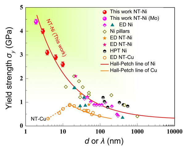 金屬材料的強化是長期以來材料領域的核心研究方向。細晶強化(即Hall-Petch強化,包括晶界強化/孿晶界強化)是目前最常用且有效的強化手段之一,其內在機制是源于晶界/孿晶界對位錯運動的阻礙。然而,當晶粒尺寸(d)和孿晶片層厚度( )達到某個臨界尺寸(10-15nm)時,材料的主導變形機制將轉變為晶界運動或退孿生,從而使其表現出Hall-Petch關系失效或軟化效應(即材料強度隨著d/ 的降低而不再增加甚至降低),成為了材料強度提升的瓶頸問題。