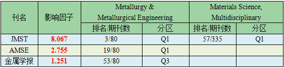金屬所三種SCI期刊的影響因子和分區(qū)情況