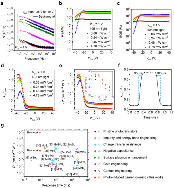 圖2. 光電性能表征與評價。a. 噪聲密度譜;b. 響應度;c. 外量子效率;d. 信噪比;e. 探測度;f. 光響應速度;g. 二維材料光電晶體管性能對比。