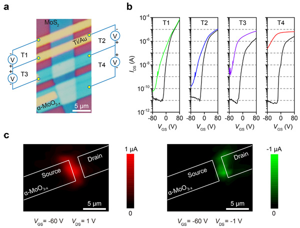 -MoO3-x);b. 光電晶體管在暗態(黑色)和光照(彩色)下的轉移特性曲線;c-d. 器件光電流的空間分布響應圖。