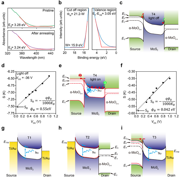 圖4 雙異質結光致勢壘降低機制。a. 氧化鉬退火前后的吸收光譜;b. 氧化鉬的紫外光電子能譜;c.暗態下器件的能帶結構圖;d.暗態下器件的肖特基勢壘高度定量表征;e.光照下器件的能帶結構圖;f. 光照下器件的肖特基勢壘高度定量表征;g. 器件T1(Ti/Au, Ti/Au)的工作原理圖;h. 器件T2(