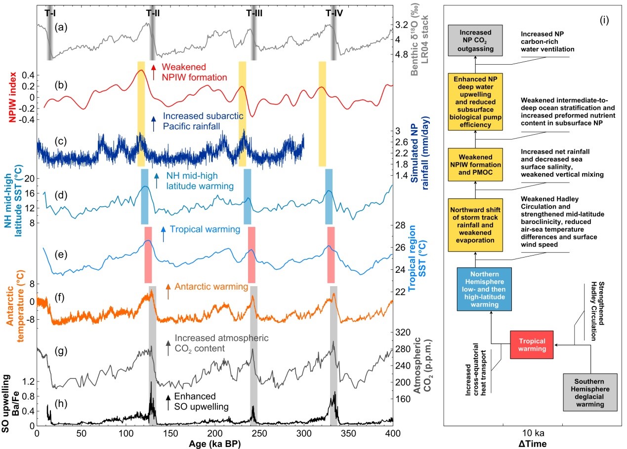 沖繩海槽水體氧化還原狀態(tài)可以受到北太平洋中層水的強(qiáng)烈影響,因此是研究北太平洋中層水演化的理想?yún)^(qū)域。據(jù)此,研究人員利用沖繩海槽沉積物氧化還原敏感元素恢復(fù)了過去40萬年以來的水體氧化還原演化歷史,基于此進(jìn)一步重建了北太平洋中層水演化歷史。研究發(fā)現(xiàn),北太平洋中層水的形成在冰期較強(qiáng),間冰期相對(duì)較弱。但從冰期到間冰期減弱的過程要晚于南大洋冰消期上升流的增強(qiáng)(即南大洋碳釋放)約1萬年。結(jié)合模擬結(jié)果,研究人員發(fā)現(xiàn),該滯后的現(xiàn)象主要響應(yīng)于南北半球間熱量的傳輸時(shí)間差異,其導(dǎo)致的經(jīng)向溫度梯度變化控制著北太平洋凈降水量的變化,進(jìn)而影響該區(qū)域水團(tuán)的下沉以及中層水的形成。間冰期減弱的北太平洋中層水使得底層水與上部水體分層性減弱,從而有利于上升流的形成和深部碳的釋放,這可能對(duì)維持間冰期大氣CO2的高位水平做出了一定貢獻(xiàn)。