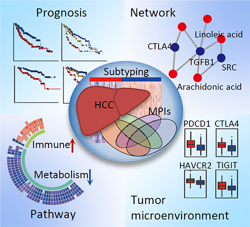 代謝重編程是癌癥核心特征之一,其作用不僅體現(xiàn)在代謝通路的變化,并可以通過復(fù)雜的代謝物-蛋白質(zhì)相互作用傳播到其他生物學(xué)過程。本工作中研究人員基于代謝物-蛋白質(zhì)相互作用網(wǎng)絡(luò)和肝癌多組學(xué)數(shù)據(jù),綜合利用復(fù)雜網(wǎng)絡(luò)和機器學(xué)習(xí)分析方法,識別了兩種在疾病預(yù)后具有顯著差異性的肝癌亞型。在代謝方面,研究發(fā)現(xiàn)預(yù)后較差的亞型與缺氧、代謝酶的高度甲基化、眾多代謝通路的下調(diào)及多種脂肪酸的累積密切相關(guān)。此外,眾多免疫相關(guān)通路在預(yù)后較差的亞型中呈現(xiàn)顯著上調(diào)的趨勢。研究人員進(jìn)一步通過代謝物-蛋白質(zhì)相互作用預(yù)測發(fā)現(xiàn)不飽和脂肪酸與多個免疫調(diào)控蛋白(例如SRC和CTLA4)存在潛在相互作用,不飽和脂肪酸的累積可能是免疫通路上調(diào)的潛在原因。上述肝癌亞型及其生物學(xué)特征在多組獨立的肝癌隊列上得到了驗證。同時,研究人員利用肝癌細(xì)胞系,通過轉(zhuǎn)錄組學(xué)和代謝組學(xué)實驗驗證了主要計算分析結(jié)果。本工作為肝癌精準(zhǔn)醫(yī)療提供了重要線索。