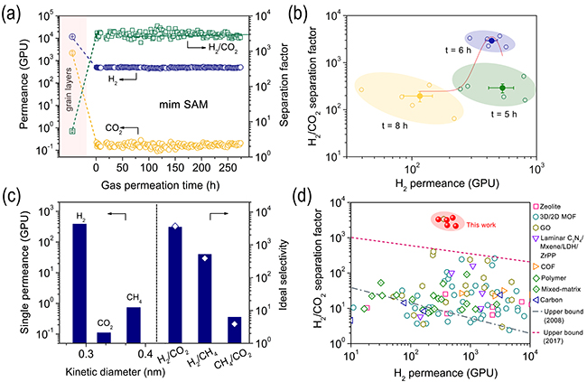 本工作中,該團隊借助具有開放金屬位的活性基層,誘導mim蒸氣分子在活性基層上定向“著陸”,實現(xiàn)“零維分子”的有序組裝,形成高度取向的超分子陣列膜(Supramolecule array membrane, SAM),即“零維”分子篩膜,可利用該分子篩膜的埃米級分子間隔,實現(xiàn)精確篩分具有微小尺寸差異的H2(0.289nm)和CO2(0.33nm)分子。研究發(fā)現(xiàn),“零維”分子篩膜中的構筑基元憑借超分子的相互作用有序聚集,可全面消除經(jīng)典分子篩膜的晶間缺陷,與目前性能最優(yōu)的分子篩膜相比,其H2和CO2的分離選擇性提高了一個數(shù)量級。“零維”分子篩膜以“零維分子”直接作為基元構筑新一代分子篩膜,該理念變革了傳統(tǒng)分子篩膜的構筑基元類型、微觀堆砌模式和分離傳輸通道,對分子篩膜的發(fā)展具有重要指導意義。