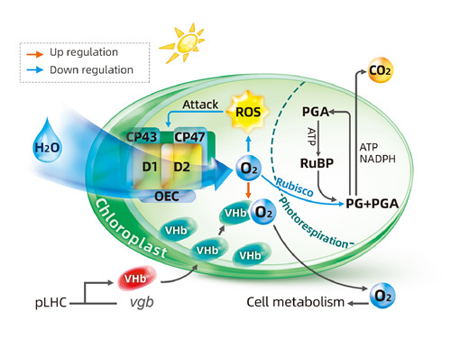 圖1 表達(dá)透明顫菌血紅蛋白的微擬球藻細(xì)胞內(nèi)氧分布和調(diào)節(jié)示意圖