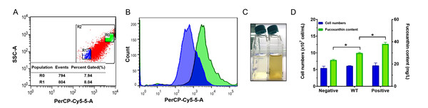 圖2 使用流式細(xì)胞技術(shù)對三角褐指藻進(jìn)行分選,篩選高含巖藻黃質(zhì)的突變株并驗證