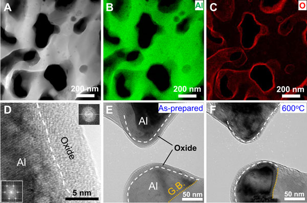 圖1 納米多孔鋁的結構表征。(A-C)納米多孔鋁孔棱的HAADF-STEM圖像和EDS元素分布圖;(D)納米多孔鋁孔棱的HRTEM圖像;(E,F)氧化鋁層在600 C下退火 0.5h前后的準原位TEM 圖像。
