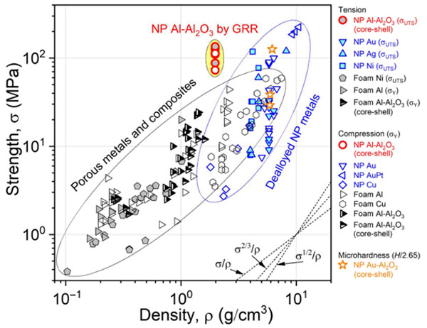 該團隊將脫合金腐蝕與置換反應(GRR)相結合,成功制備出無裂紋的高質量納米多孔鋁樣品。其孔棱直徑約為200納米,且孔棱表面覆蓋有自發生成且可自修復的氧化鋁納米殼層(圖1)。該納米氧化膜不僅阻止材料進一步氧化和自燃,而且大幅降低表面擴散速率,從而提高納米多孔鋁的熱穩定性。該材料納米多孔結構在接近鋁熔點溫度下仍能保持穩定而不發生顯著結構粗化。由于該材料較好的多孔結構聯結性和優異的承載效率,以及表面氧化膜的強化作用,納米多孔鋁在拉伸和壓縮條件下均表現出高強度。其強度遠高于同等密度傳統泡沫金屬材料。與已報道的納米多孔金屬相比,納米多孔鋁不僅更穩定,而且密度更低,比強度更高(圖2)。該研究不僅為發展新型輕質高強度新材料提供新思路,也為探索高溫等極限條件下納米多孔金屬功能應用提供契機。