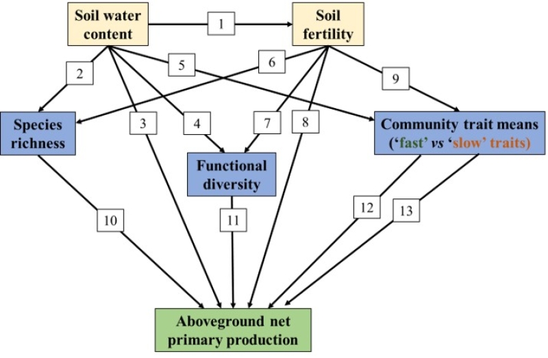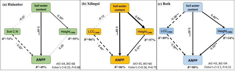 以上結(jié)果表明,我國溫帶草原長期處于水分缺乏的自然條件下,植物在長期的進化過程中,形成了適應干旱生境的逆境屬性,致使植物群落性狀均值成為了調(diào)控草原初級生產(chǎn)力應對干旱環(huán)境的主要驅(qū)動因素。在草地資源的管理和利用過程中要重視物種的功能屬性及土壤養(yǎng)分在維持草地群落功能及穩(wěn)定性過程中的重要作用,該結(jié)果證明了溫帶草原植物群落性狀的種內(nèi)、種間互補性的重要意義,有助于解釋草原植物群落性狀變化規(guī)律及其與群落生產(chǎn)力的關(guān)系,完善草本植物的生長及功能生態(tài)適應機制。