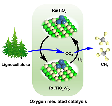 本工作中,合作團隊發(fā)展了一種載體氧缺陷介導方法,將“生物質氧化到CO2”與“CO2催化加氫到CH4”兩個過程耦合起來,成功實現(xiàn)了較溫和條件下的生物質資源直接甲烷化過程。研究發(fā)現(xiàn),生物質分子被Ru/TiO2催化劑的晶格氧氧化至CO2,并在催化劑上生成氧缺陷;隨后,CO2加氫還原到CH4過程中,裂解出的氧原子會填充氧缺陷從而恢復催化劑。該催化過程在溫度低至120 時仍可穩(wěn)定催化甘油水溶液產(chǎn)生CH4。該工作為生物質資源的有效利用提供了新思路。
