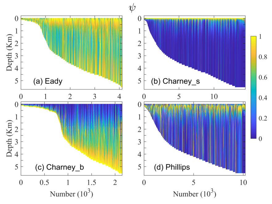 近日,中科院海洋環流與波動重點實驗室王凡團隊通過線性穩定性分析獲得了全球大部分海區的斜壓不穩定特征,并將其歸納為四種類型:表層和底層強、中間弱的類Eady型,表層最強、向底層遞減的類Charney型(Charney_s),底層最強、向表層遞減的類Charney型(Charney_b),次表層最強、向表層和底層遞減的類Phillips型。