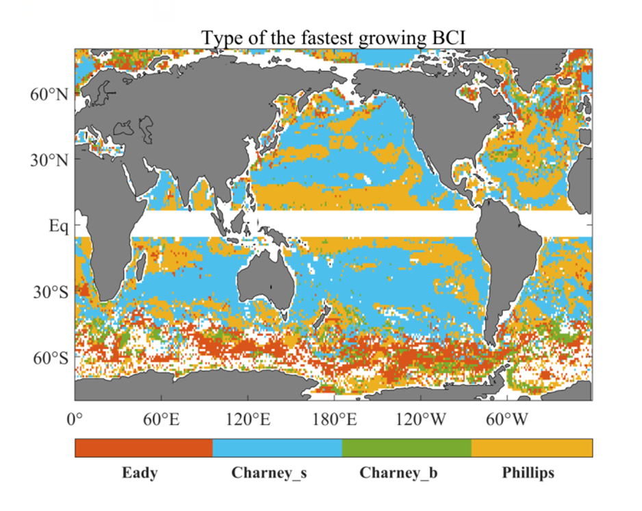 類Eady型主要分布在南極繞極流主軸和北半球高緯度區域;Charney_b型零星分布在Eady型周圍;Charney_s型分布最為廣泛,遍布全球大部分區域,集中在副熱帶(10 –35 )區域;類Phillips型則主要分布在低緯度(5 –20 )及黑潮以南、秘魯智利以西和北大西洋中高緯度區域。