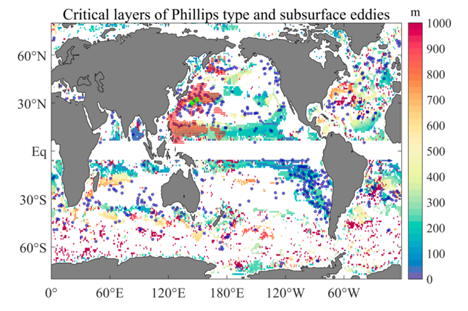 Phillips型(次表層型)不穩定臨界層深度(陰影)和觀測到的次表層渦旋位置(藍色圓點,紅色圓點和綠色菱形)