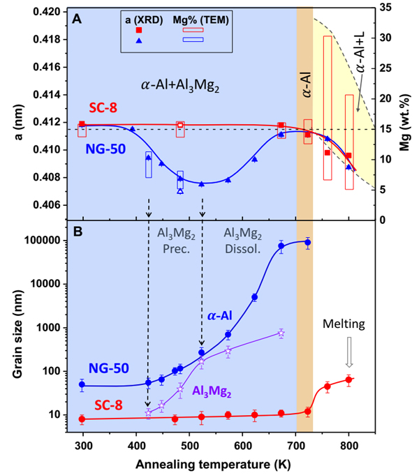圖2. Al-Mg合金受限晶體的(SC-8)晶格常數(shù)、晶格中鎂含量及晶粒尺寸隨退