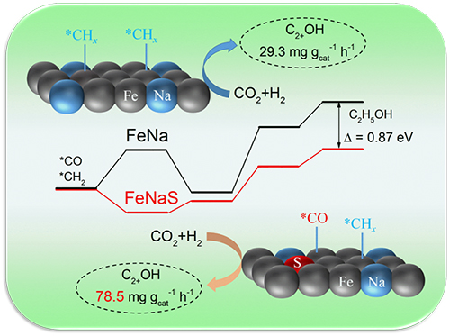 本工作提出了一種Na-S協(xié)同改性的鐵催化劑,可在較為溫和的反應條件下實現(xiàn)與FeCu、FeRh等復合金屬催化劑相當?shù)母咛即际章省a和S對Fe位點電子性質(zhì)的作用與耦合,使得在單一金屬相上實現(xiàn)了CO解離與非解離吸附能力的匹配,為高碳醇合成催化劑的設(shè)計提供了新思路。