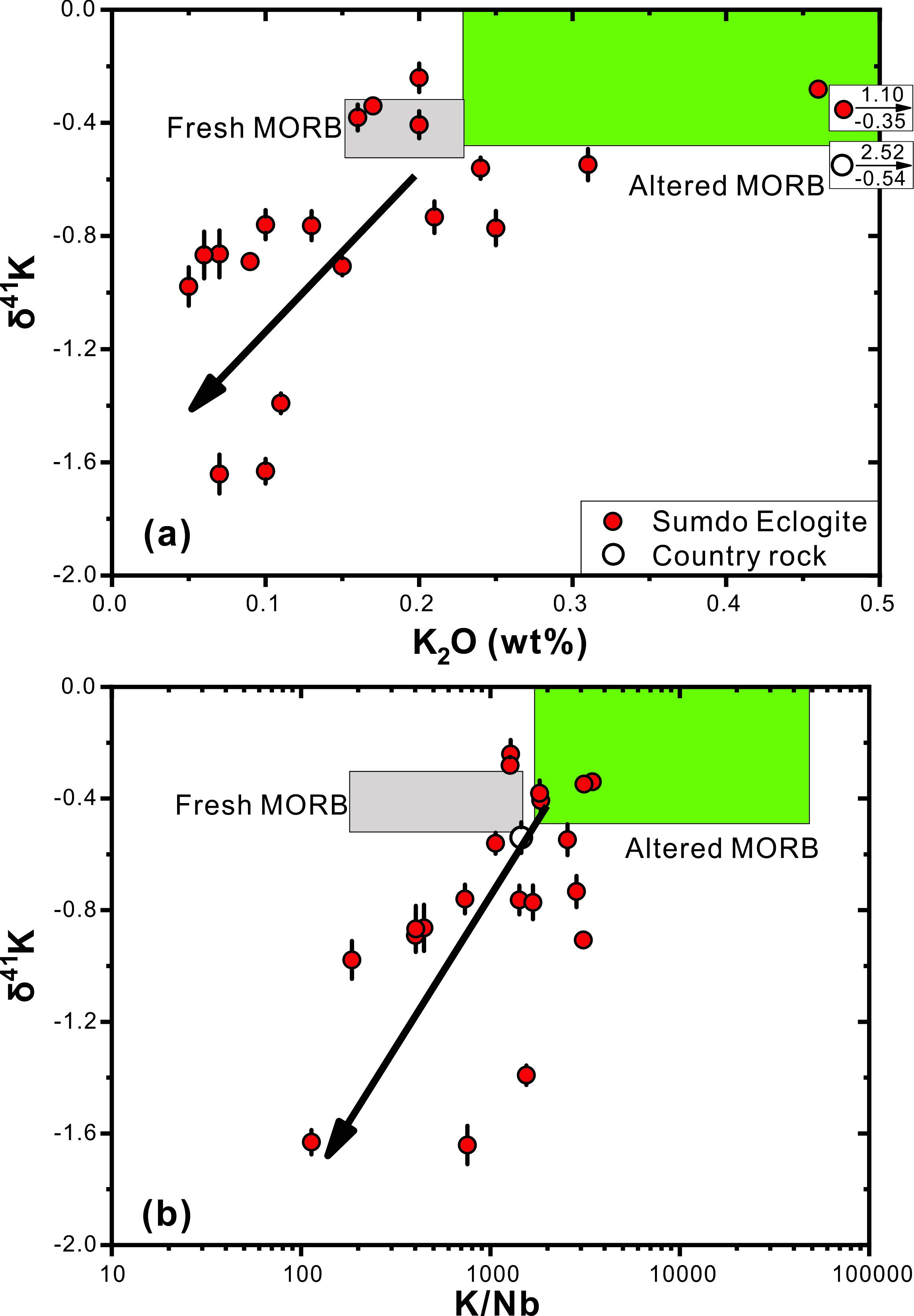 該成果的研究樣品包含蝕變洋殼玄武巖和大洋俯沖帶高壓變質巖。其中,洋殼玄武巖樣品代表了洋殼最上層,經歷了不同類型和不同強度低溫蝕變的玄武巖,榴輝巖為經歷了洋殼低溫蝕變和高溫變質脫水過程的高壓變質巖,是研究低溫蝕變過程中K同位素地球化學行為和俯沖過程K同位素地球化學的理想樣品。研究結果顯示,與未蝕變玄武巖相比,研究的蝕變玄武巖樣品 41K值具有大的變化范圍(-0.76‰ ~ -0.17‰),表明低溫洋殼蝕變過程中可以產生顯著的K同位素分餾。樣品鉀同位素組成與蝕變類型及蝕變指標無明顯相關性。結合已發表數據,本研究認為在形成蝕變礦物的過程中,海水與蝕變礦物之間的平衡以及動力學分餾作用是造成低溫蝕變洋殼K同位素特征的原因。本項目模擬了海水分離進入基底流體的過程,結果顯示不同分餾系數和分離程度可以獲得不同鉆孔的K同位素特征。研究獲得了低溫蝕變洋殼的參考值 41K為-0.40 0.33‰ (2sd),該參考值與新鮮洋中脊玄武巖類似,但明顯低于海水的K同位素組成( 41K = +0.12 0.07‰, 2sd)。因此,本研究證明了低溫洋殼蝕變過程是形成海水重K同位素組成的重要原因。