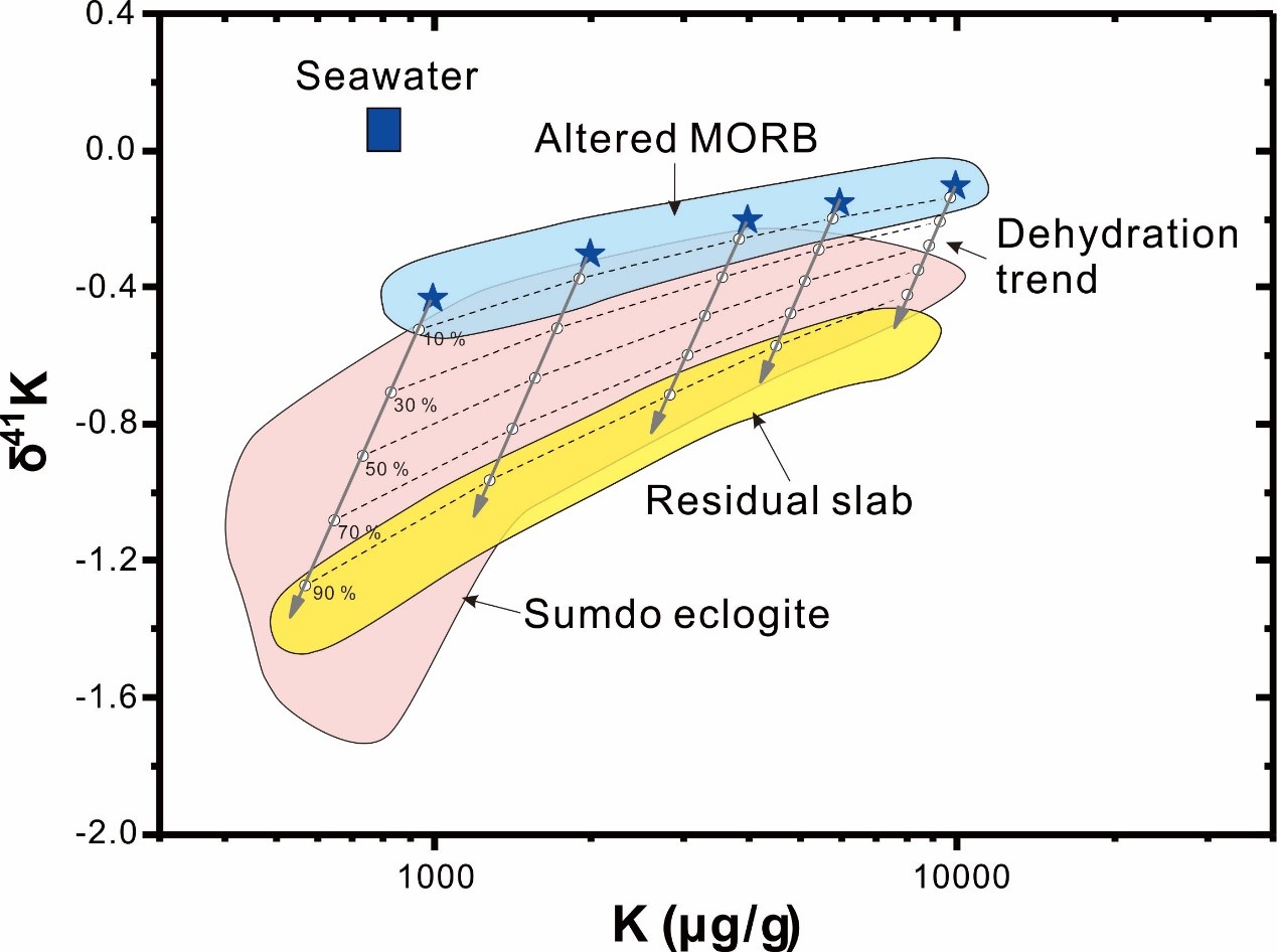 在俯沖帶,蝕變洋殼將發生變質脫水,并俯沖進入深部地幔,這些過程將會對全球K元素循環產生哪些影響呢?深俯沖的地殼物質又會如何影響深部地幔的組成呢?帶著以上問題,科研人員進一步研究了大洋俯沖帶榴輝巖,結果顯示原巖為蝕變洋殼的榴輝巖具有低的K含量(415-9132 g/g)和輕的K同位素組成( 41K值-1.64 to -0.24‰),同時榴輝巖樣品 41K值與K2O含量和K/Nb比值具有較好的相關性。K和鈮(Nb)不相容程度類似,但相比于Nb,K具有更強的流體活動性,K/Nb比值的降低代表了俯沖變質脫水過程中K的丟失。因此, 41K值與K2O和K/Nb的相關性表明榴輝巖輕的K同位素組成可能是由變質脫水過程導致的。通過瑞利分餾模型進行了變質脫水過程中K同位素行為的模擬。模擬結果顯示,不同程度蝕變的洋殼經歷不同程度的脫水,不僅可以形成榴輝巖輕的K同位素特征,而且可以形成榴輝巖 41K與K2O之間的相關性,進一步證明了以上結論。
