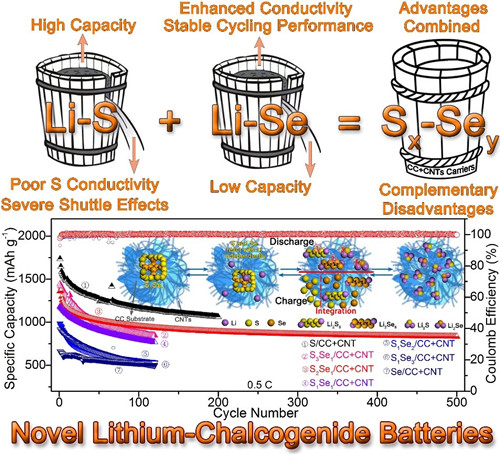 青島能源所先進儲能材料與技術研究組武建飛研究員多年來深耕鋰硫電池領域,針對鋰硫電池的本征缺陷提出了多種解決思路,并且取得了一系列的創新性研究成果(Journal of Materials Chemistry A, 6 (2018), 23486-23494; Electrochimica Acta, 295 (2019), 684-692; ACS Applied Materials & Interfaces, 11 (2019), 15607-15615; Advanced Materials Interfaces, 2020, 2001698)。業界在前期的研究發現,與硫同族的硒元素具有和硫類似的轉化反應機理,并且鋰硒電池的“穿梭效應”可以明顯得到抑制。但較為可惜的是,與鋰硫電池相比,鋰硒電池容量較低,無法滿足高比能電池的要求。針對這一問題,該研究組博士生楊澤文巧妙利用硫和硒的協同作用,通過彌補各自體系的“木桶短板”,成功設計開發了一種具有雙碳雙活性物質的新型鋰-硫(硒)電池體系。該體系以殼聚糖基衍生碳為基底,三維纏繞碳納米管構成雙碳的活性物質載體,這可以有效提高三維碳載體骨架的導電性和結構穩定性;另外,通過煅燒方式負載硫-硒復合物作為活性材料,最終獲得具有高容量、高循環穩定性能的鋰硫(硒)電池正極材料。研究結果表明,在0.5 C(1 C=1340 mA g-1)電流密度下,電池經過500次循環后仍然保持833.2 mAh g-1的高比容量。此外,該工作還利用簡便有效的測試手段對此電池體系的充放電機理進行了探討,得出了硫-硒復合物作為活性物質的反應機理為鋰硫和鋰硒電池基本反應步驟的組合。本工作為解決鋰硫電池的本征缺陷問題提供了新的參考思路;同時,也為硫族元素在鋰金屬電池中的研究和應用奠定了基礎。本工作的相關研究成果最近以“Novel Lithium-Chalcogenide Batteries Combining S, Se and C Characteristics Supported by Chitosan-Derived Carbon Intertwined with CNTs”為題發表在國際著名期刊Chemical Engineering Journal上(Chemical Engineering Journal, 2022, 427, 131790。IF=13.273)。(文/圖 楊澤文 張源)