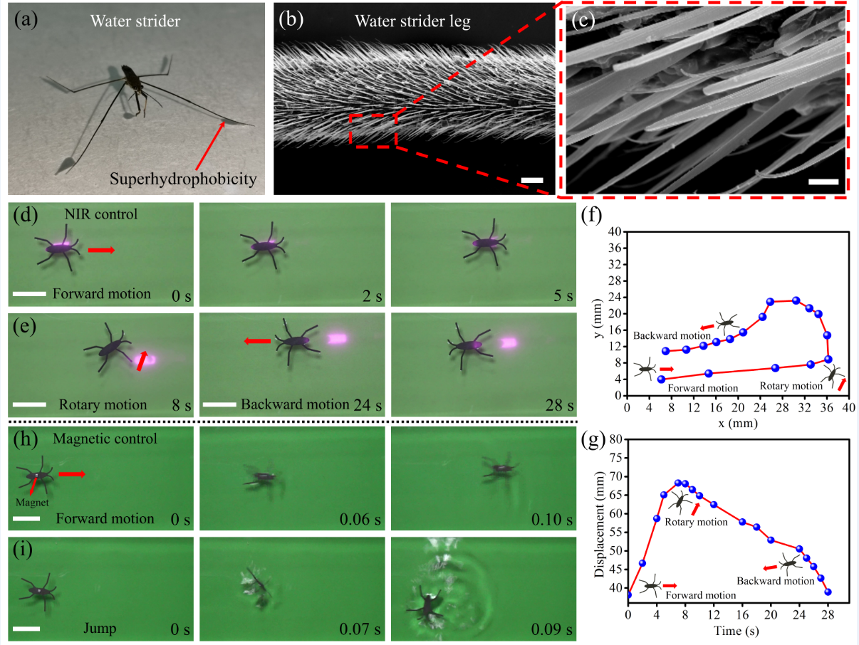 沈陽(yáng)自動(dòng)化所微納米課題組的科研人員從自然界中的水黽獲得靈感,開(kāi)展了超疏水材料制備及機(jī)器人多場(chǎng)聯(lián)合驅(qū)動(dòng)的研究。結(jié)合PDMS、石墨烯、磁性顆粒制備了具有光相應(yīng)、磁響應(yīng)及超疏水特性的復(fù)合材料,加工出了仿水黽微型機(jī)器人。結(jié)合微型機(jī)器人的光敏特性,利用紅外激光實(shí)現(xiàn)了微型機(jī)器人在水面的可控運(yùn)動(dòng)。基于磁驅(qū)動(dòng)技術(shù)與材料的超疏水特性,實(shí)現(xiàn)了微型機(jī)器人在水面的快速游動(dòng)、跳躍及翻滾動(dòng)作。該研究實(shí)現(xiàn)了新材料制備與多場(chǎng)驅(qū)動(dòng)技術(shù)的融合,為仿昆蟲(chóng)機(jī)器人的研究提供了新的思路。