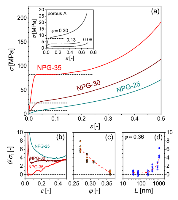 圖1. 納米多孔金的壓縮變形行為。(a) 不同相對密度納米多孔金的壓縮應力應變曲線。小圖為不同相對密度常規多孔鋁的壓縮應力應變曲線。(b) 不同相對密度納米多孔金歸一化后的加工硬化率隨壓縮應變的變化情況。(c) 納米多孔金歸一化加工硬化率隨相對密度的變化。(d) 相對密度為0.36的NPG-35樣品的加工硬化率隨孔棱尺寸的變化情況。