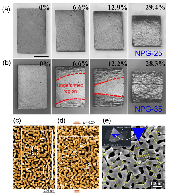 圖2. 納米多孔金的均勻與非均勻變形。相對密度為0.27的NPG-25樣品 (a) 和相對密度為0.36的NPG-35樣品 (b) 壓縮不同應變后的表面形貌光鏡照片。(c-d) 為NPG-25樣品壓縮20%前后局部變形情況。可見孔棱發生彎曲變形和懸掛孔棱發生搭接。(e) 壓縮10%的NPG-35中,變形帶內的孔棱發生位錯雪崩式滑移變形的痕跡。