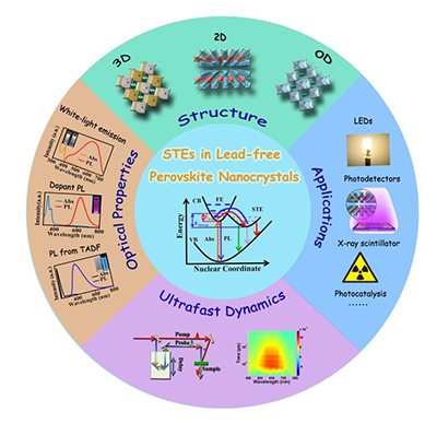 文章系統(tǒng)評述了該團隊與國內外同行在非鉛鈣鈦礦納米晶發(fā)光機制及自陷激子動力學方面的研究進展,通過超快動力學研究,闡明了限制材料輻射躍遷復合的關鍵動力學機制,并以此指導非鉛鈣鈦礦納米晶材料設計。文章還討論了基于自陷激子介導的能量轉移發(fā)光機制。此外,基于自陷激子寬譜發(fā)射、發(fā)光壽命長的特點,文章展望了基于自陷激子的非鉛鈣鈦礦納米晶材料的應用和前景,同時也指出了許多亟待解決的問題。